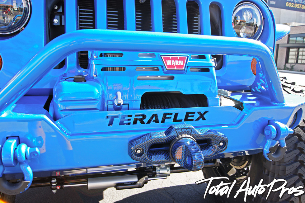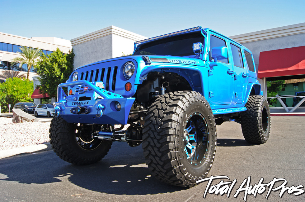 2015 Jeep Wrangler Unlimited Rubicon in Hydro Blue | AEV 6.4L Vvt HEMI Conversion | 6” Teraflex Long Arm Kit with Colored Match Link Arms | Fox Racing Shox’s w Bump Stops | Painted Teraflex Front & Rear Bumpers, HD Hinged Carrier, Vacuum Pump Bracket, Custom Pinstriped Teraflex Big Brake Kit, Hand Pinstriped Teraflex HD Dana 44 Diff Covers | Painted Daystar D-Ring Shackles w Isolators | Painted Warn Powerplant Winch | PSC Hydraulic Steering Ram | Fox Adjustable Steering Stabilizer | 40x15.50R20 Toyo Open Country M/T | 20x12 Fuel Offroad Crush 2 Piece Wheels Custom Painted | Painted Poison Spyder Crusher Flares and DIY Rico Side Steps | Custom Finished Rigid Industries 50” SR Series Hybrid LED Light Bar | Spyder LED Tail Lights Smoked | JW Speaker 8700 Evolution J Series LED Headlights | Custom Black Leather & Suede Interior with Blue Stitching | Weather Tech FloorLiners | Premium Tint | Hertz 6.5” Component Set with 28mm Tweeters | Hertz 12” Subwoofer | Alpine 9” In Dash Head Unit | Alpine Amplifiers | Red Top Optima Battery | G2 Gears | Powertank Air Tank | Rugged Ridge Hood Lift Kit | Magnaflow Satin Stainless Steel Muffler | Moose Built Custom Exhaust | Accessory Parts Hydro Dipped