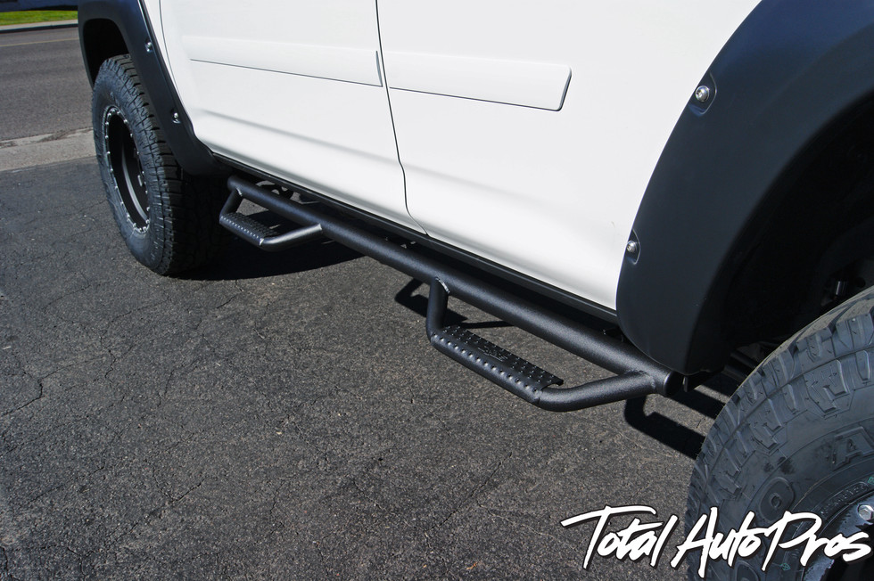 2016 Toyota 4Runner Trail White | Traxda 3” Front 1.25” Rear Leveling Kit | 17x9 The Standard Method Race Wheels in Matte Black | 285/70R17 Toyo Open Country ATII Xtreme | nFab Wheel to Wheel Nerf Steps | Bushwacker Pocket Style Fender Flares | Matte Black Painted Toyota Logo, 4Runner Emblems and Roof Rails