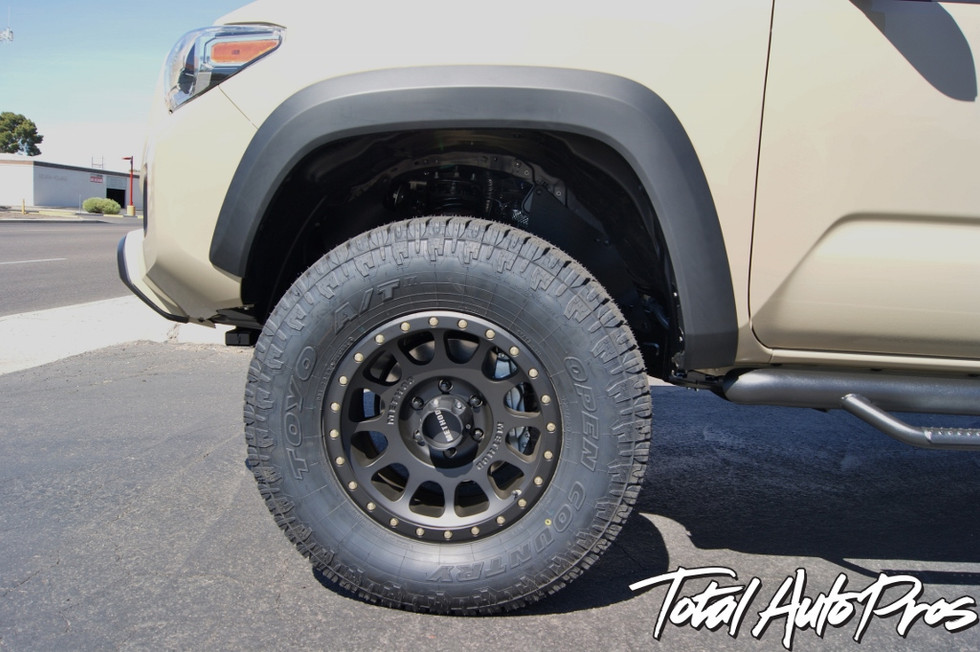 This custom 2016 Toyota Tacoma TRD in Quicksand is loaded with aftermarket accessories. We installed a Traxda Tacoma 3” Front & 1” Rear Leveling Kit. Replacing the factory tires and wheels with 17x8.5 6-5.5 Method Race Wheel NV Matte Black +0 Offset on 285/70R17 Toyo Open Country ATII Tires. We finished this custom build off by painting the factory Toyota Tacoma grille satin black and putting a set of Rough Country wheel to wheel nerf steps on it.